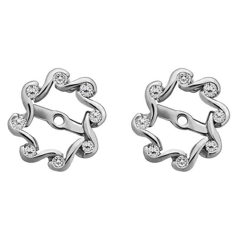 These earring jackets feature 16 round, prong set stones weighing 0.24 carats. Earring jackets are sold in pairs. They weigh approximately 1.54 grams. This pair of earring jackets will fit the following size studs (weights are per STONE carat weight, not PAIR of earrings carat weight):Made to fit a round stud earring from 0.75 up to 1.25 carats or a princess cut stud from 1 up to 2 carats (per stud).