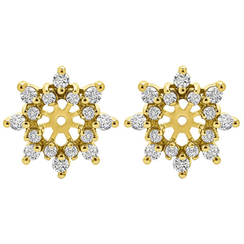These earring jackets feature 32 round, prong set stones weighing 0.48 carats. Earring jackets are sold in pairs. They weigh approximately 2.72 grams. This pair of earring jackets will fit the following size studs (weights are per STONE carat weight, not PAIR of earrings carat weight):Made to fit a round stud earring from 0.15 up to 0.5 carats or a princess cut stud from 0.25 up to 0.75 carats (per stud).