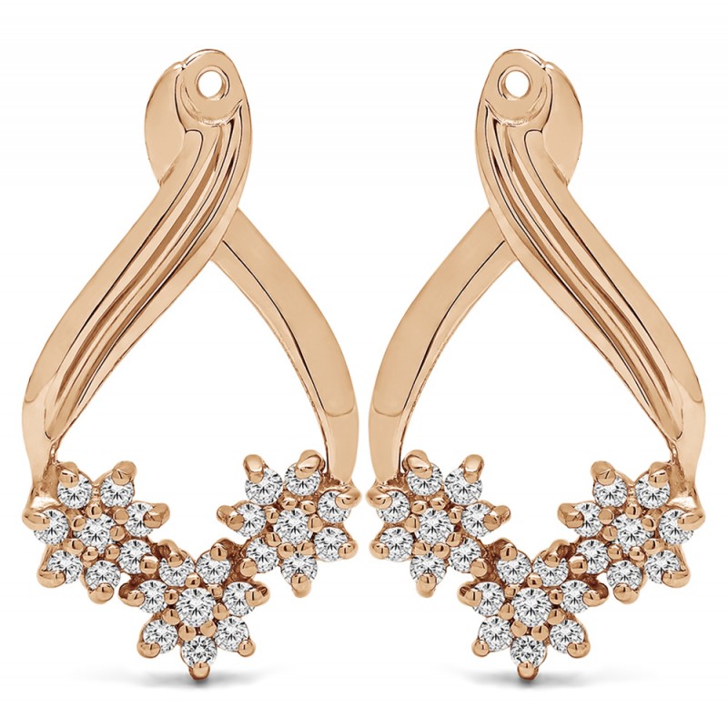 These earring jackets feature 48 round, prong set stones weighing 0.54 carats. Earring jackets are sold in pairs. They weigh approximately 5.52 grams. This pair of earring jackets will fit the following size studs (weights are per STONE carat weight, not PAIR of earrings carat weight):Made to fit a round stud earring from 0.15 up to 0.75 carats or a princess cut stud from 0.25 up to 0.75 carats (per stud).