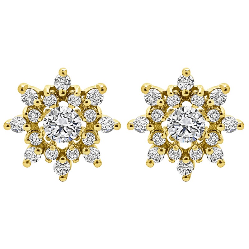 These earring jackets feature 32 round, prong set stones weighing 0.96 carats. Earring jackets are sold in pairs. They weigh approximately 3.97 grams. This pair of earring jackets will fit the following size studs (weights are per STONE carat weight, not PAIR of earrings carat weight):Made to fit a round stud earring from 0.25 up to 0.75 carats or a princess cut stud from 0.4 up to 0.75 carats (per stud).
