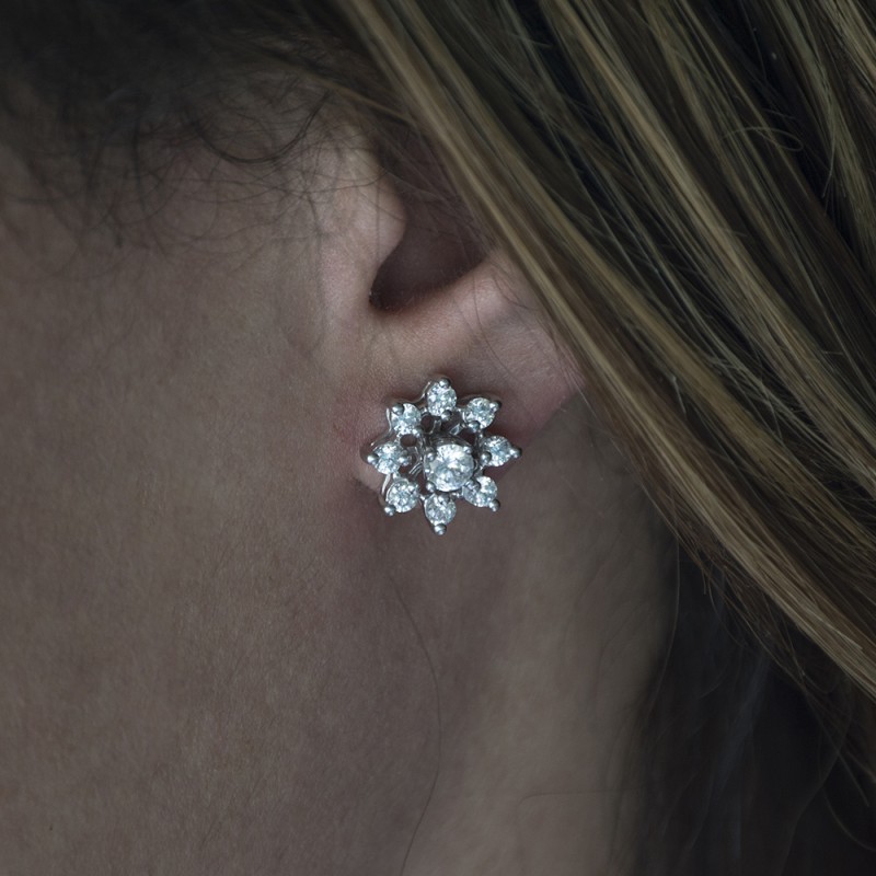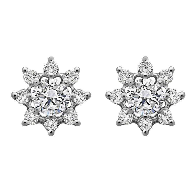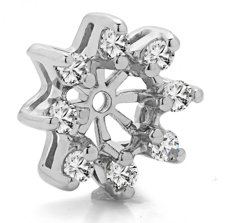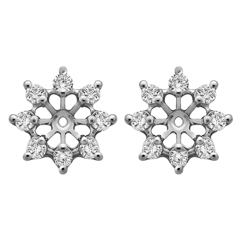 These earring jackets feature 16 round, prong set stones weighing 0.96 carats. Earring jackets are sold in pairs. They weigh approximately 3.54 grams. This pair of earring jackets will fit the following size studs (weights are per STONE carat weight, not PAIR of earrings carat weight):Made to fit a round stud earring from 0.3 up to 0.75 carats or a princess cut stud from 0.5 up to 1 carats (per stud).