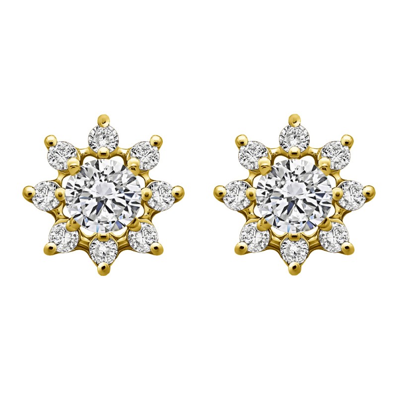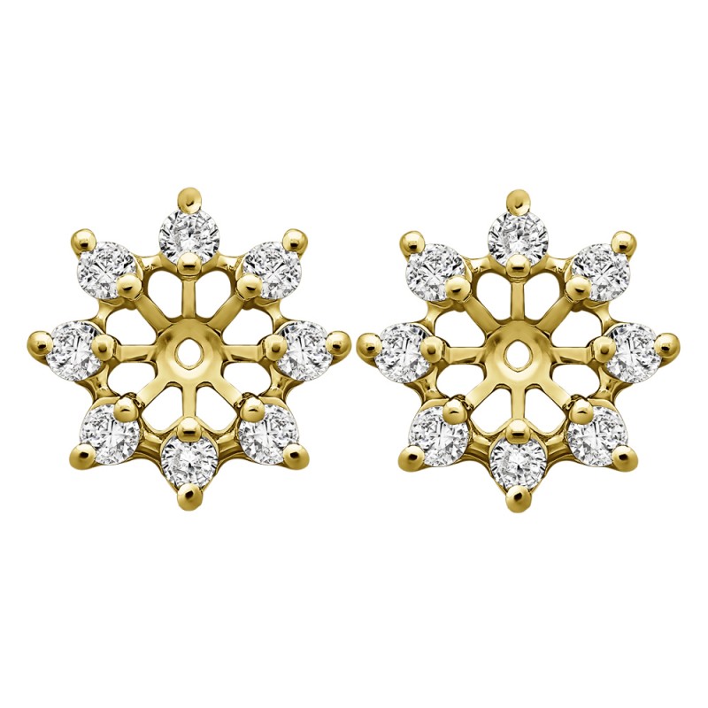 These earring jackets feature 16 round, prong set stones weighing 0.96 carats. Earring jackets are sold in pairs. They weigh approximately 3.54 grams. This pair of earring jackets will fit the following size studs (weights are per STONE carat weight, not PAIR of earrings carat weight):Made to fit a round stud earring from 0.3 up to 0.75 carats or a princess cut stud from 0.5 up to 1 carats (per stud).