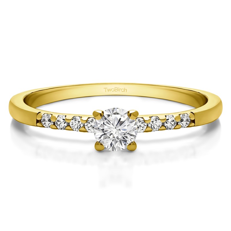 This engagement ring features a round center stone, surrounded by 8 round side stones. It has a 0.22 carat center stone, and 0.1 carats of side stones, giving the engagement ring a total weight of 0.32 carats. The band measures about 1.62 millimeters wide. All TwoBirch engagement rings are made with conflict free and eco-conscious metals and stones.