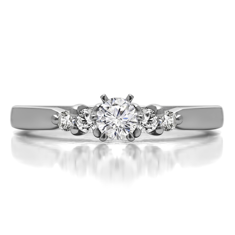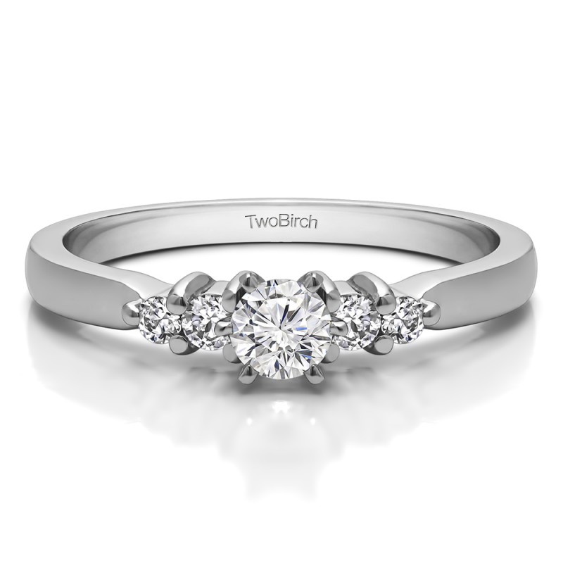 This engagement ring features a round center stone, surrounded by 4 round side stones. It has a 0.2 carat center stone, and 0.16 carats of side stones, giving the engagement ring a total weight of 0.36 carats. The band measures about 2.05 millimeters wide. All TwoBirch engagement rings are made with conflict free and eco-conscious metals and stones.