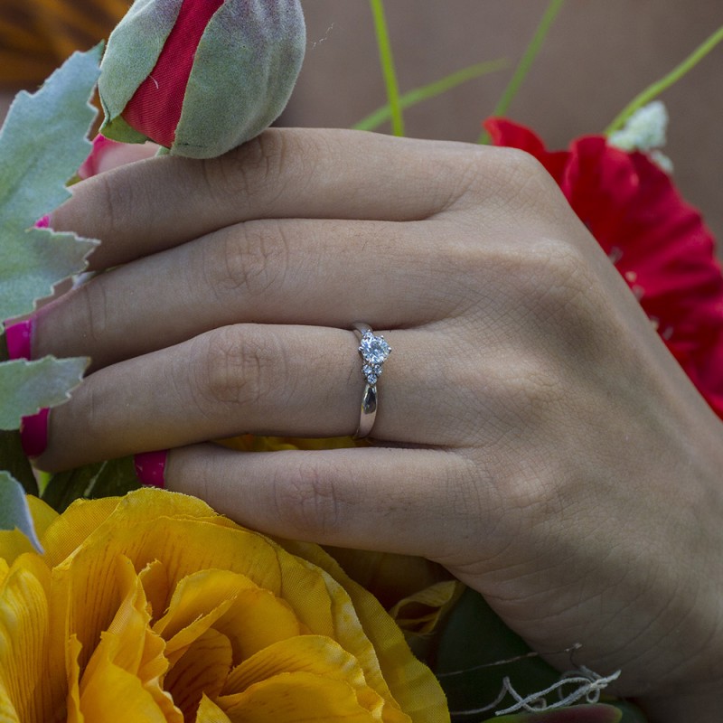 This engagement ring features a round center stone, surrounded by 6 round side stones. It has a 0.42 carat center stone, and 0.09 carats of side stones, giving the engagement ring a total weight of 0.51 carats. The band measures about 2 millimeters wide. All TwoBirch engagement rings are made with conflict free and eco-conscious metals and stones.