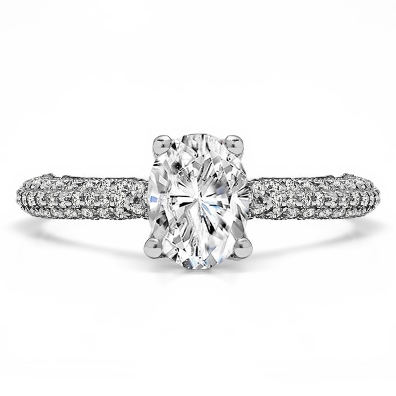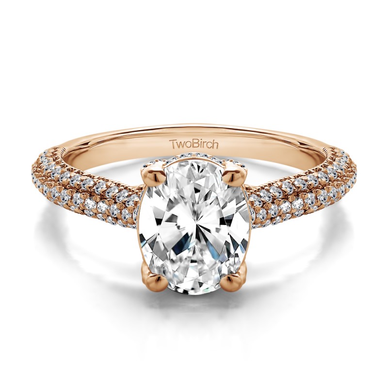 This engagement ring features an oval center stone, surrounded by 102 round side stones. It has a 1.25 carat center stone, and 0.41 carats of side stones, giving the engagement ring a total weight of 1.66 carats. The band measures about 3 millimeters wide. All TwoBirch engagement rings are made with conflict free and eco-conscious metals and stones.