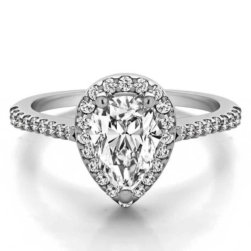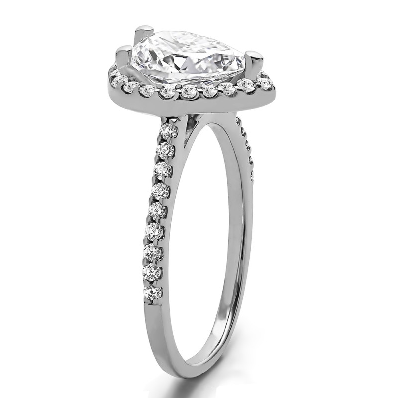This engagement ring features a pear shaped center stone, surrounded by 40 round side stones. It has a 1.25 carat center stone, and 0.55 carats of side stones, giving the engagement ring a total weight of 1.8 carats. The band measures about 2 millimeters wide. All TwoBirch engagement rings are made with conflict free and eco-conscious metals and stones.