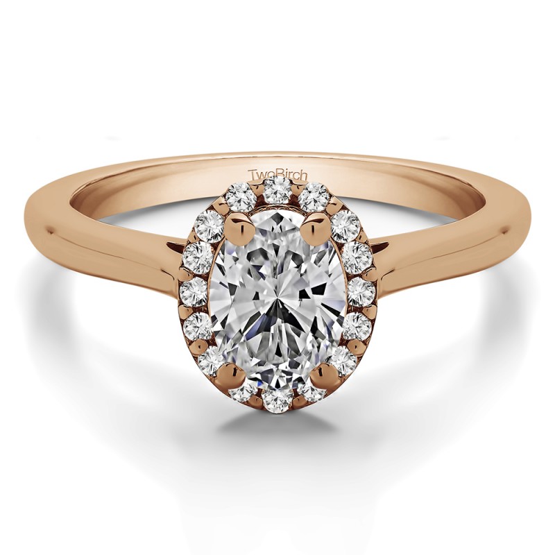 This engagement ring features an oval shaped center stone, surrounded by 18 round side stones. It has a 1 carat center stone, and 0.14 carats of side stones, giving the engagement ring a total weight of 1.14 carats. The band measures about 2 millimeters wide. All TwoBirch engagement rings are made with conflict free and eco-conscious metals and stones.