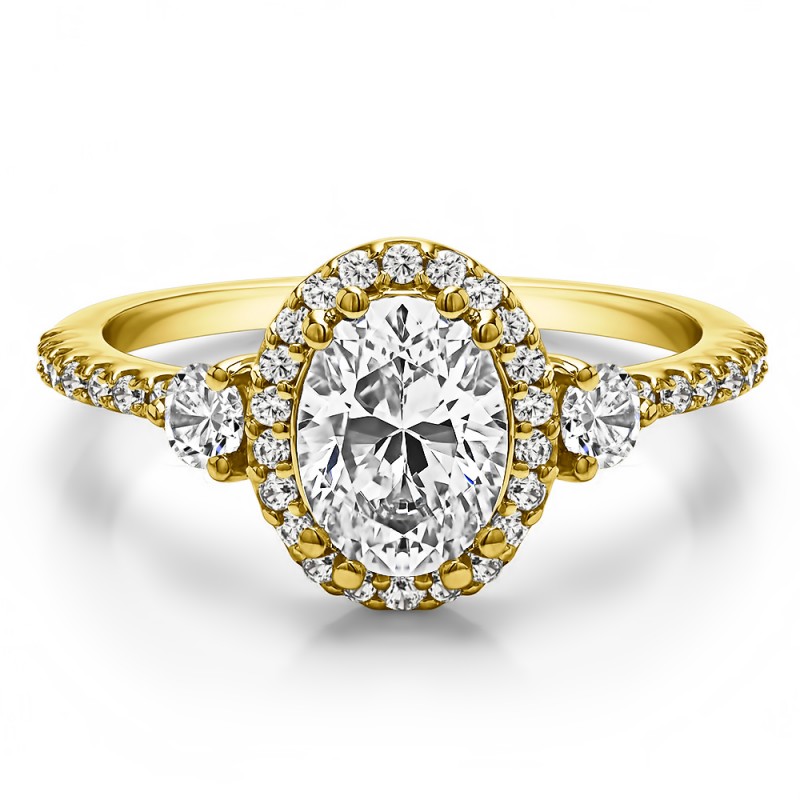 This engagement ring features a oval shaped center stone, surrounded by 34 round side stones. It has a 1 carat center stone, and 0.38 carats of side stones, giving the engagement ring a total weight of 1.38 carats. The band measures about 2 millimeters wide. All TwoBirch engagement rings are made with conflict free and eco-conscious metals and stones.
