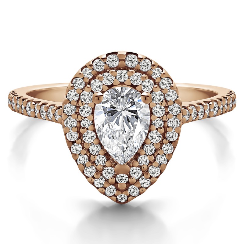 This engagement ring features a pear shaped center stone, surrounded by 67 round side stones. It has a 0.75 carat center stone, and 0.39 carats of side stones, giving the engagement ring a total weight of 1.14 carats. The band measures about 2 millimeters wide. All TwoBirch engagement rings are made with conflict free and eco-conscious metals and stones.
