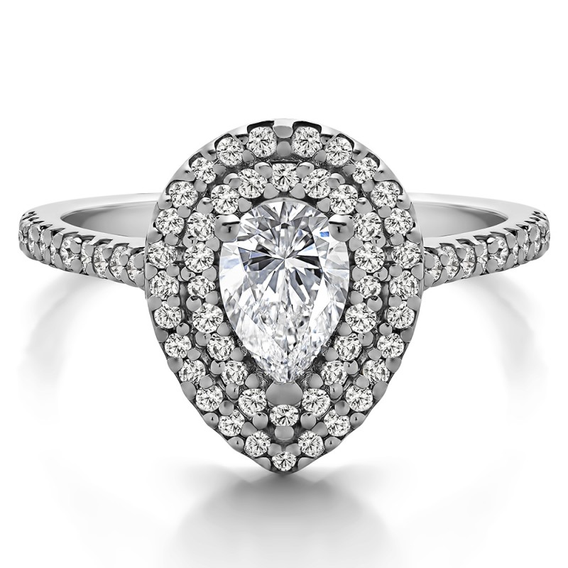 This engagement ring features a pear shaped center stone, surrounded by 67 round side stones. It has a 0.75 carat center stone, and 0.39 carats of side stones, giving the engagement ring a total weight of 1.14 carats. The band measures about 2 millimeters wide. All TwoBirch engagement rings are made with conflict free and eco-conscious metals and stones.