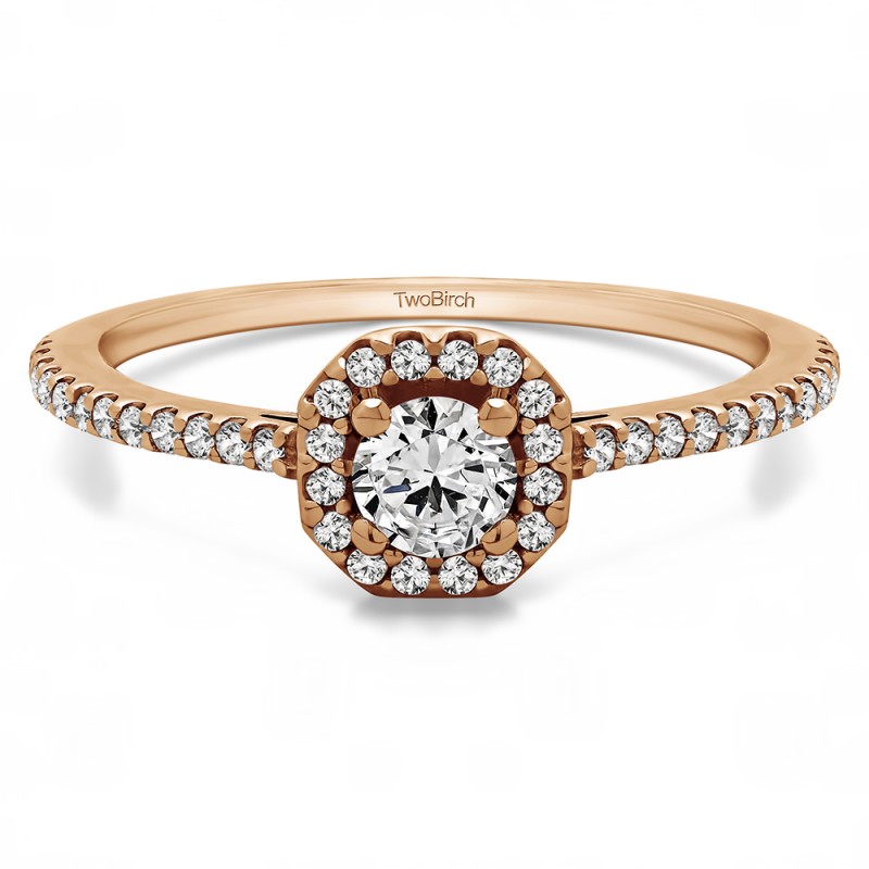This engagement ring features a round center stone, surrounded by 40 round side stones. It has a 0.25 carat center stone, and 0.22 carats of side stones, giving the engagement ring a total weight of 0.47 carats. The band measures about 1.8 millimeters wide. All TwoBirch engagement rings are made with conflict free and eco-conscious metals and stones.