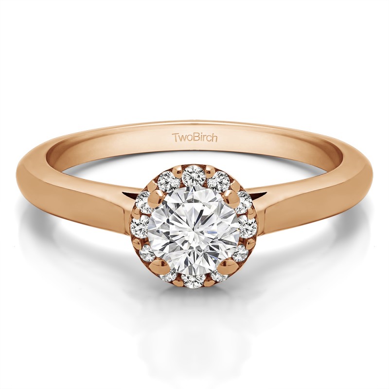 This engagement ring features a round center stone, surrounded by 16 round side stones. It has a 0.41 carat center stone, and 0.08 carats of side stones, giving the engagement ring a total weight of 0.49 carats. The band measures about 2 millimeters wide. All TwoBirch engagement rings are made with conflict free and eco-conscious metals and stones.