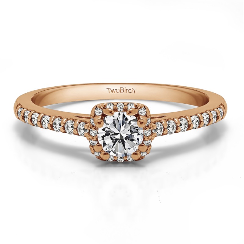 This engagement ring features a round center stone, surrounded by 30 round side stones. It has a 0.33 carat center stone, and 0.25 carats of side stones, giving the engagement ring a total weight of 0.58 carats. The band measures about 1.93 millimeters wide. All TwoBirch engagement rings are made with conflict free and eco-conscious metals and stones.