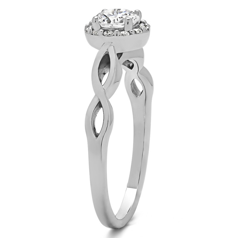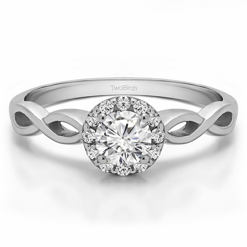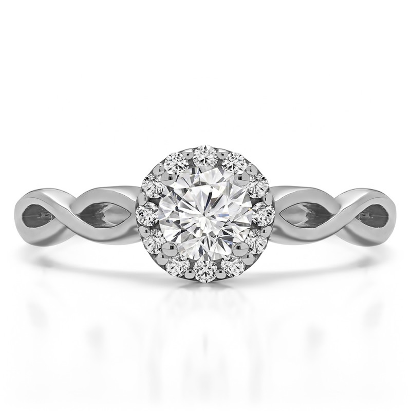 This engagement ring features a round center stone, surrounded by 12 round side stones. It has a 0.5 carat center stone, and 0.12 carats of side stones, giving the engagement ring a total weight of 0.62 carats. The band measures about 3 millimeters wide. All TwoBirch engagement rings are made with conflict free and eco-conscious metals and stones.
