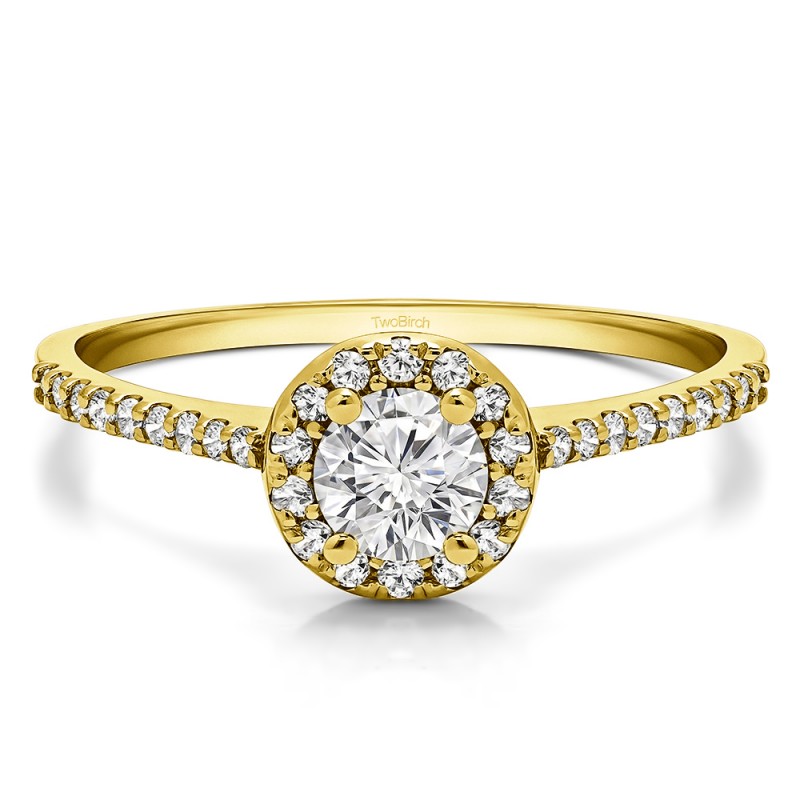 This engagement ring features a round center stone, surrounded by 32 round side stones. It has a 0.5 carat center stone, and 0.24 carats of side stones, giving the engagement ring a total weight of 0.74 carats. The band measures about 3 millimeters wide. All TwoBirch engagement rings are made with conflict free and eco-conscious metals and stones.