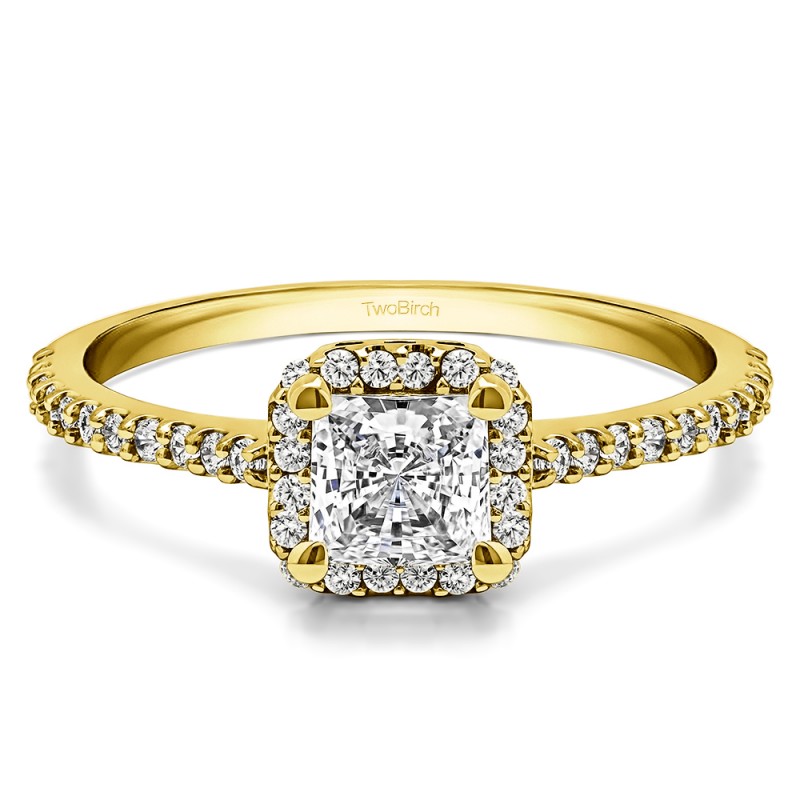 This engagement ring features a princess cut center stone, surrounded by 40 round side stones. It has a 0.5 carat center stone, and 0.26 carats of side stones, giving the engagement ring a total weight of 0.76 carats. The band measures about 3 millimeters wide. All TwoBirch engagement rings are made with conflict free and eco-conscious metals and stones.