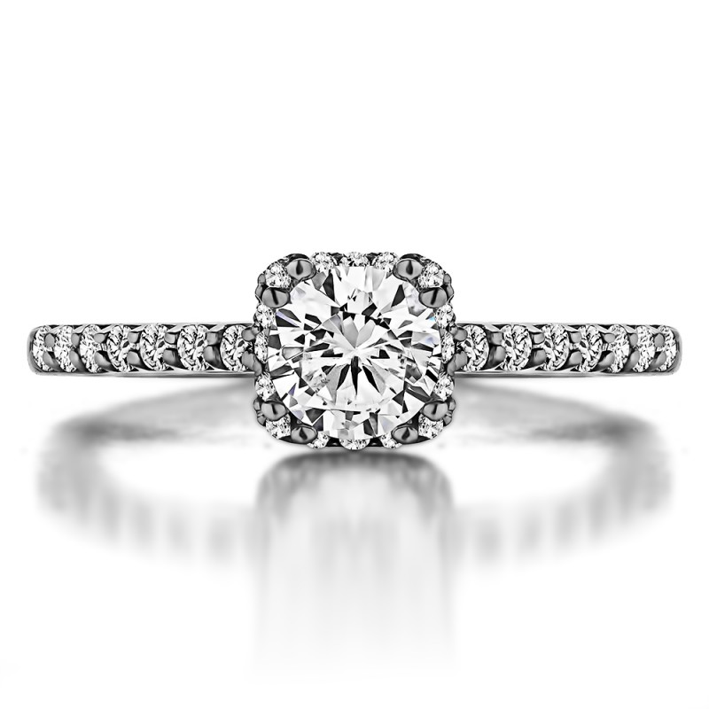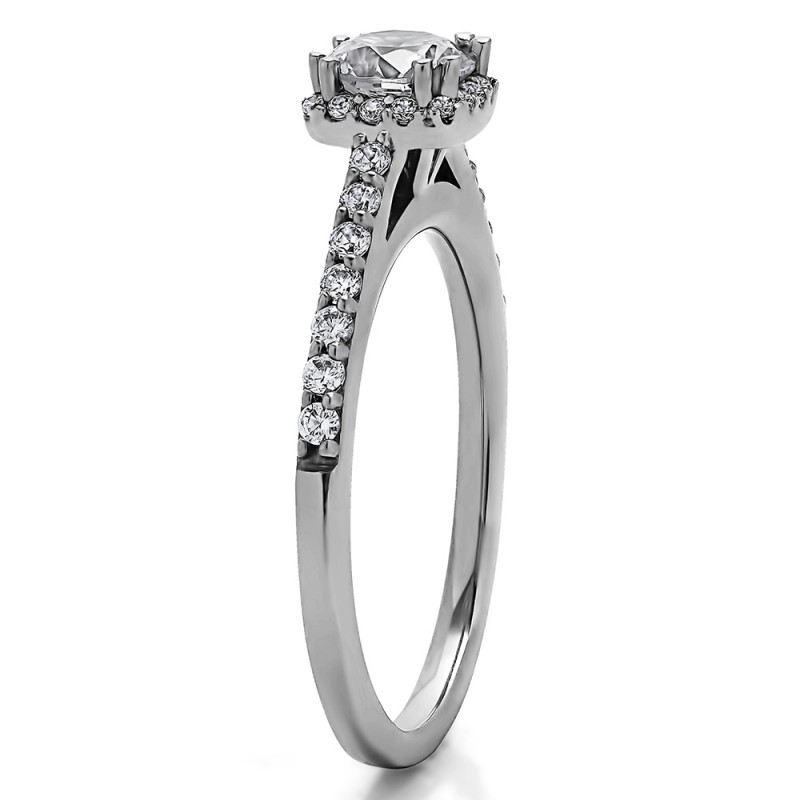 This engagement ring features a round center stone, surrounded by 30 round side stones. It has a 0.5 carat center stone, and 0.29 carats of side stones, giving the engagement ring a total weight of 0.79 carats. The band measures about 3 millimeters wide. All TwoBirch engagement rings are made with conflict free and eco-conscious metals and stones.