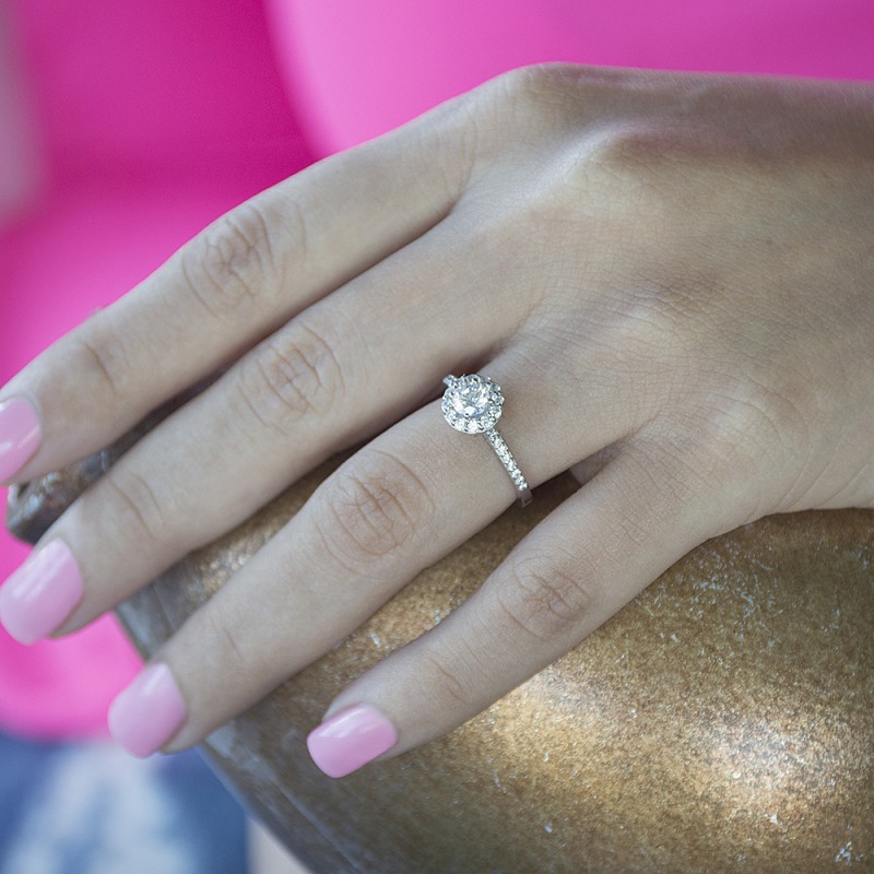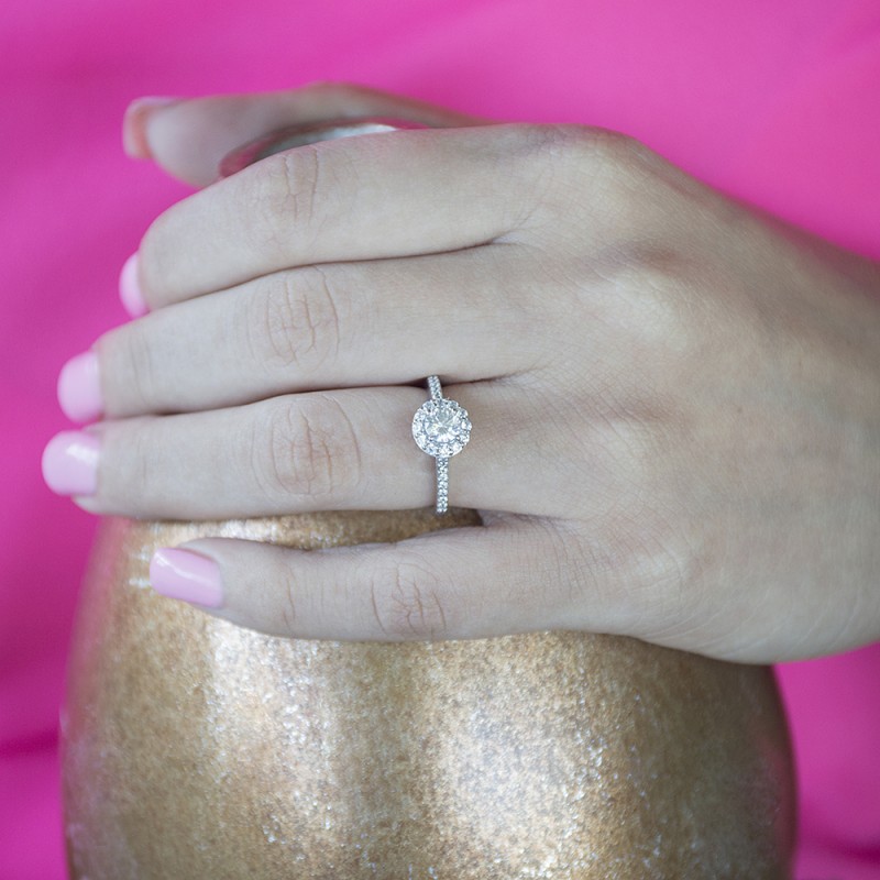 This engagement ring features a round center stone, surrounded by 28 round side stones. It has a 0.5 carat center stone, and 0.42 carats of side stones, giving the engagement ring a total weight of 0.92 carats. The band measures about 3 millimeters wide. All TwoBirch engagement rings are made with conflict free and eco-conscious metals and stones.