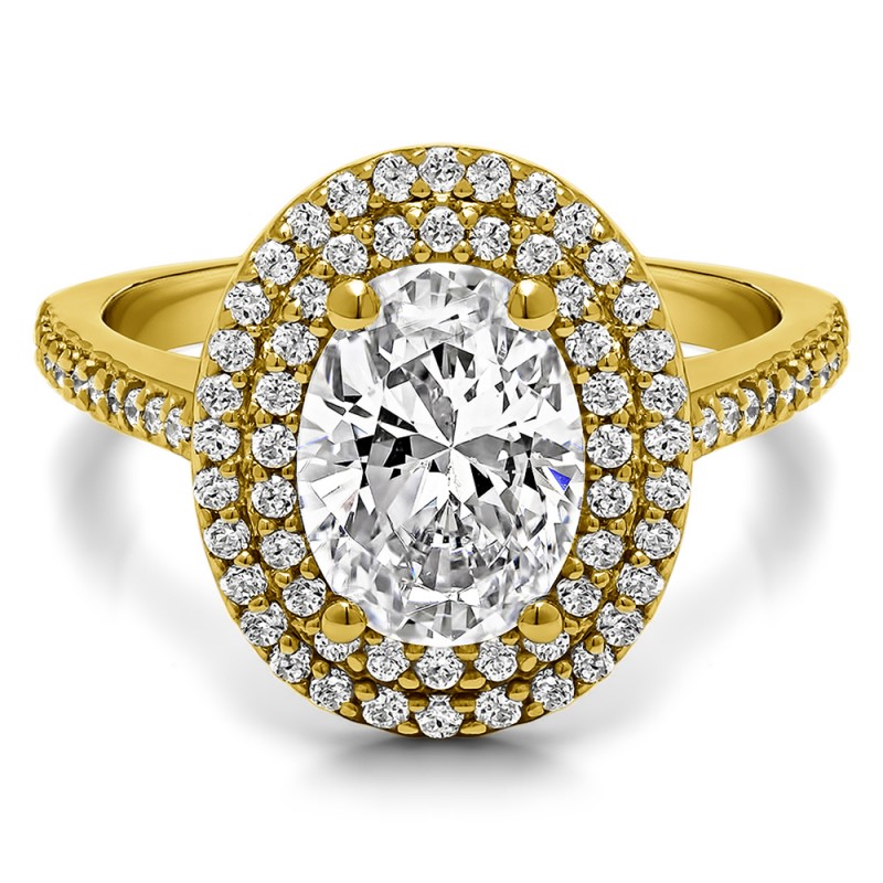 This engagement ring features an oval center stone, surrounded by 68 round side stones. It has a 1 carat center stone, and 0.34 carats of side stones, giving the engagement ring a total weight of 1.34 carats. The band measures about 3 millimeters wide. All TwoBirch engagement rings are made with conflict free and eco-conscious metals and stones.