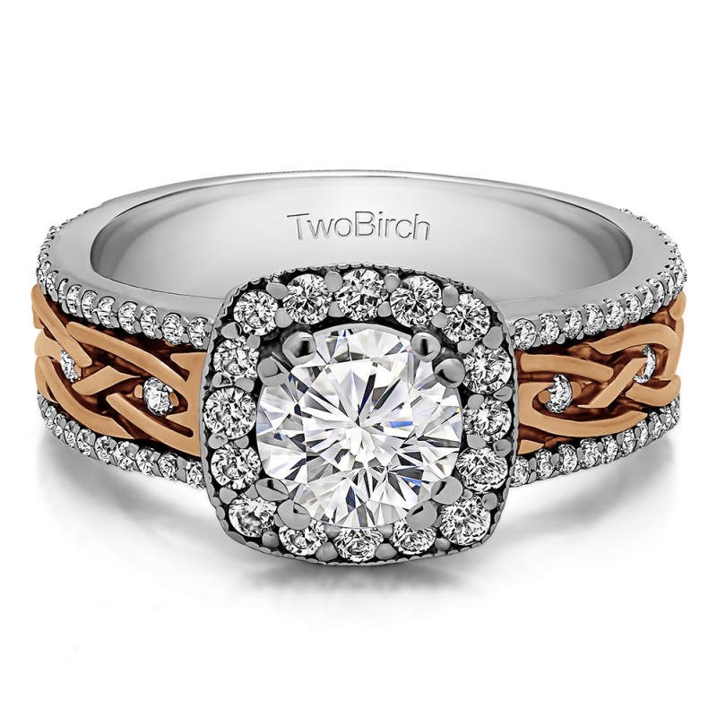 This engagement ring features a round center stone, surrounded by 84 round side stones. It has a 1 carat center stone, and 0.56 carats of side stones, giving the engagement ring a total weight of 1.56 carats. The band measures about 3 millimeters wide. All TwoBirch engagement rings are made with conflict free and eco-conscious metals and stones.
