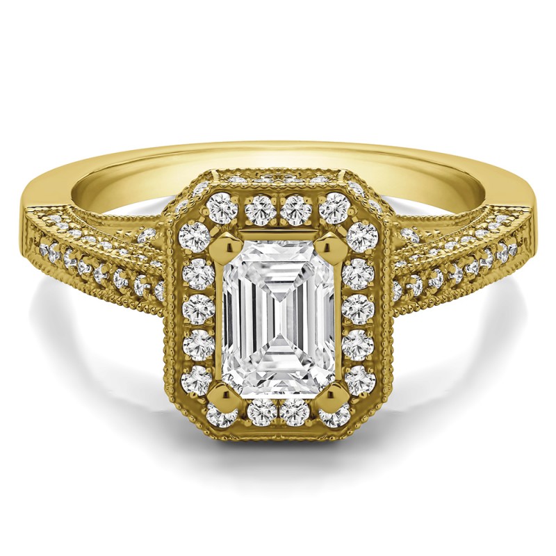 This engagement ring features an emerald center stone, surrounded by 122 round side stones. It has a 1 carat center stone, and 0.6 carats of side stones, giving the engagement ring a total weight of 1.6 carats. The band measures about 3 millimeters wide. All TwoBirch engagement rings are made with conflict free and eco-conscious metals and stones.