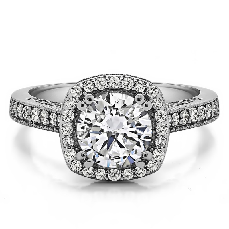 This engagement ring features a round center stone, surrounded by 46 round side stones. It has a 1.5 carat center stone, and 0.35 carats of side stones, giving the engagement ring a total weight of 1.85 carats. The band measures about 1.98 millimeters wide. All TwoBirch engagement rings are made with conflict free and eco-conscious metals and stones.