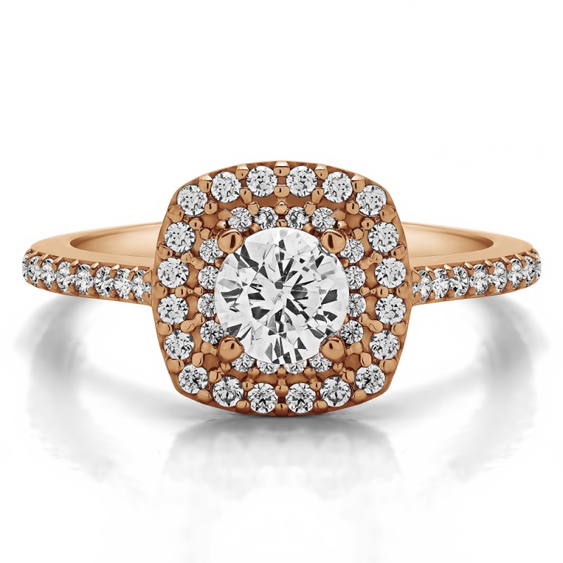 This engagement ring features a round center stone, surrounded by 52 round side stones. It has a 0.5 carat center stone, and 0.5 carats of side stones, giving the engagement ring a total weight of 1 carat. The band measures about 3 millimeters wide. All TwoBirch engagement rings are made with conflict free and eco-conscious metals and stones.