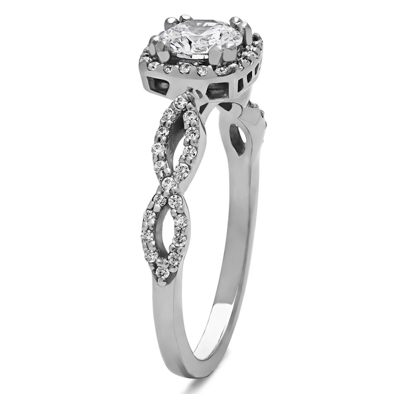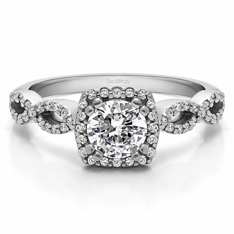This engagement ring features a round center stone, surrounded by 58 round side stones. It has a 0.75 carat center stone, and 0.25 carats of side stones, giving the engagement ring a total weight of 1 carat. The band measures about 3 millimeters wide. All TwoBirch engagement rings are made with conflict free and eco-conscious metals and stones.