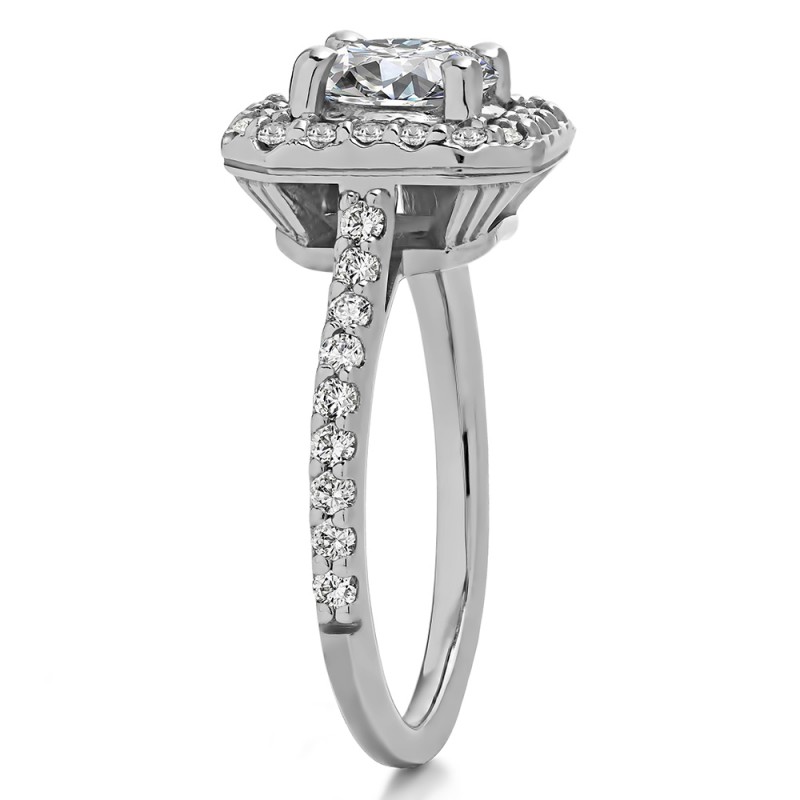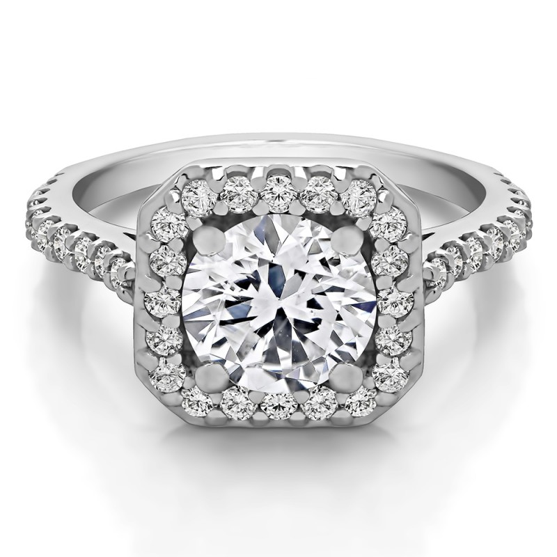 This engagement ring features a round center stone, surrounded by 38 round side stones. It has a 1.5 carat center stone, and 0.62 carats of side stones, giving the engagement ring a total weight of 2.12 carats. The band measures about 2 millimeters wide. All TwoBirch engagement rings are made with conflict free and eco-conscious metals and stones.