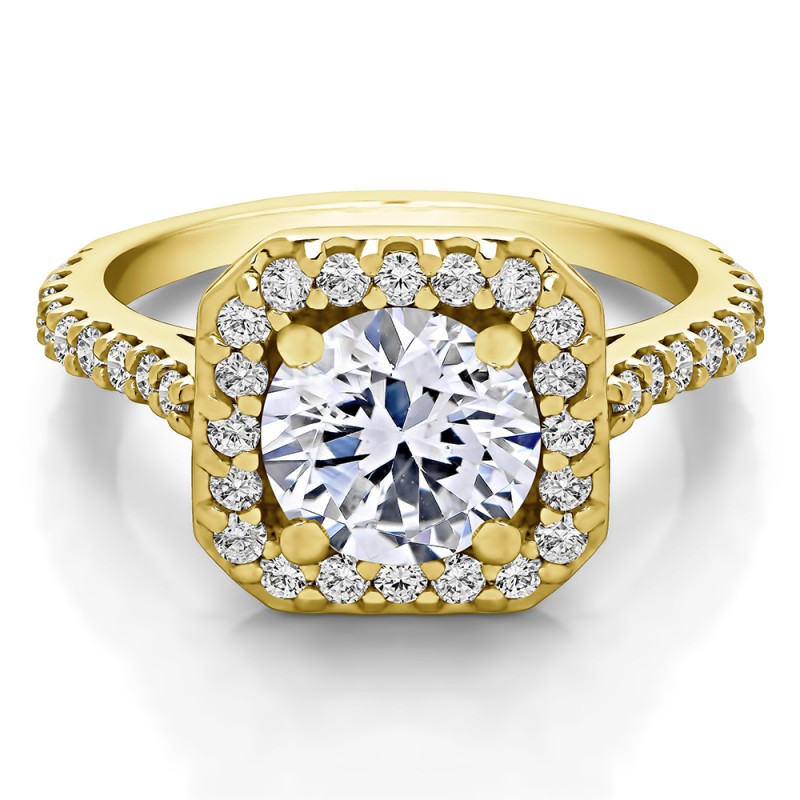 This engagement ring features a round center stone, surrounded by 38 round side stones. It has a 1.5 carat center stone, and 0.62 carats of side stones, giving the engagement ring a total weight of 2.12 carats. The band measures about 2 millimeters wide. All TwoBirch engagement rings are made with conflict free and eco-conscious metals and stones.