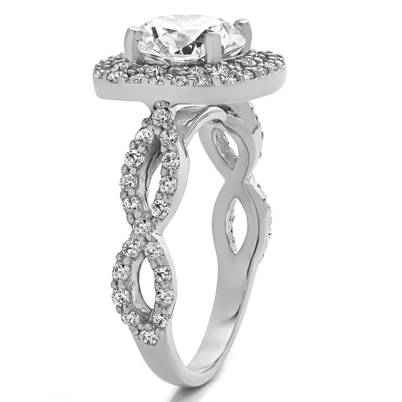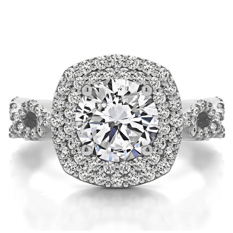 This engagement ring features a round center stone, surrounded by 82 round side stones. It has a 2 carat center stone, and 0.82 carats of side stones, giving the engagement ring a total weight of 2.82 carats. The band measures about 3 millimeters wide. All TwoBirch engagement rings are made with conflict free and eco-conscious metals and stones.