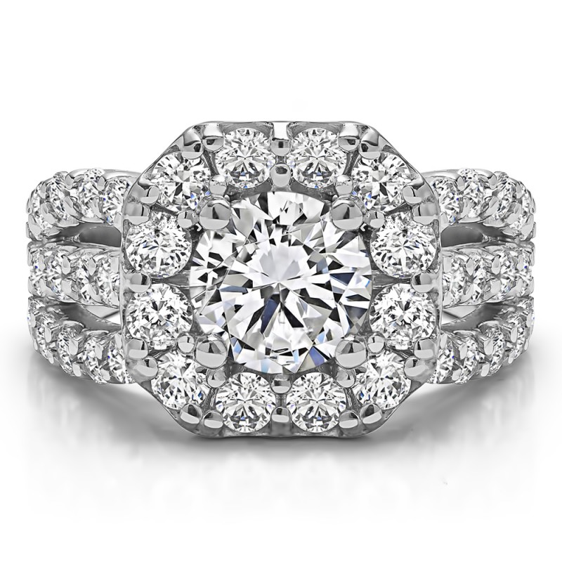 This engagement ring features a round center stone, surrounded by 42 round side stones. It has a 2 carat center stone, and 2.19 carats of side stones, giving the engagement ring a total weight of 4.19 carats. The band measures about 3 millimeters wide. All TwoBirch engagement rings are made with conflict free and eco-conscious metals and stones.