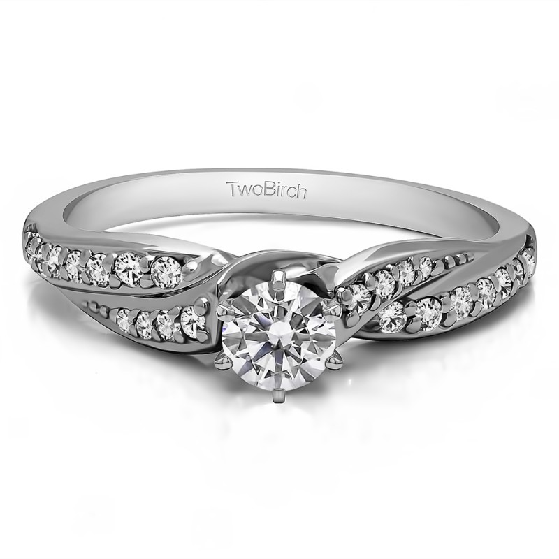 This engagement ring features a round center stone, surrounded by 24 round side stones. It has a 0.2 carat center stone, and 0.12 carats of side stones, giving the engagement ring a total weight of 0.32 carats. The band measures about 1.99 millimeters wide. All TwoBirch engagement rings are made with conflict free and eco-conscious metals and stones.