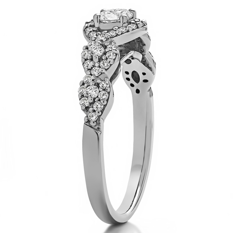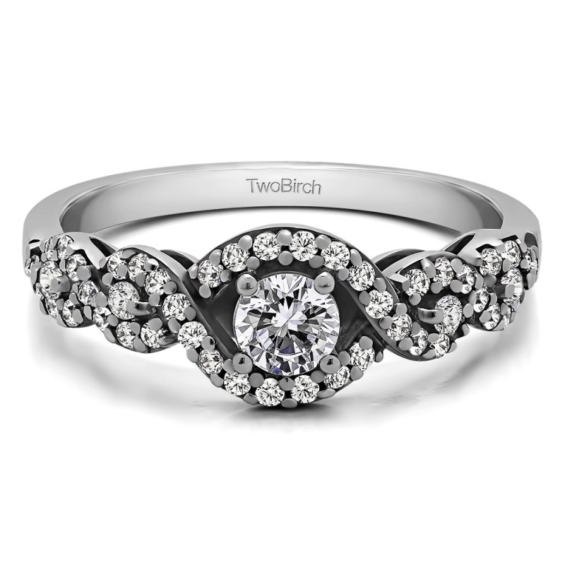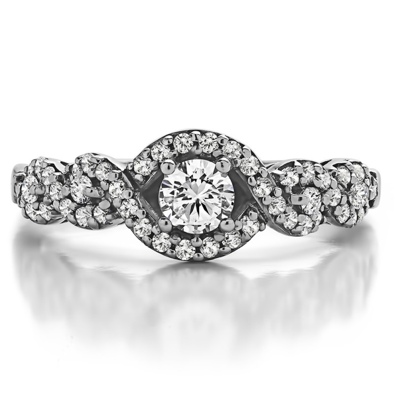 This engagement ring features a round center stone, surrounded by 48 round side stones. It has a 0.25 carat center stone, and 0.27 carats of side stones, giving the engagement ring a total weight of 0.52 carats. The band measures about 3 millimeters wide. All TwoBirch engagement rings are made with conflict free and eco-conscious metals and stones.