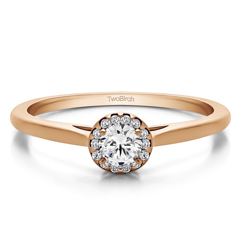 This engagement ring features a round center stone, surrounded by 14 round side stones. It has a 0.25 carat center stone, and 0.07 carats of side stones, giving the engagement ring a total weight of 0.32 carats. The band measures about 2 millimeters wide. All TwoBirch engagement rings are made with conflict free and eco-conscious metals and stones.