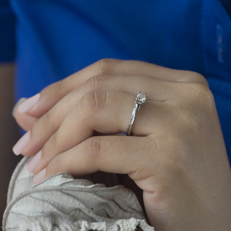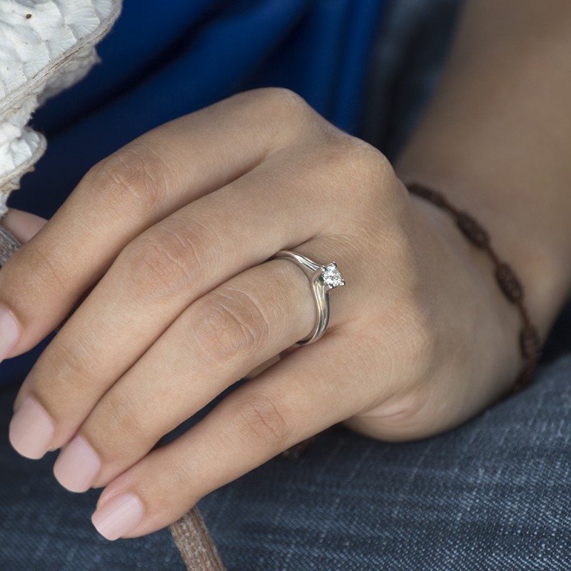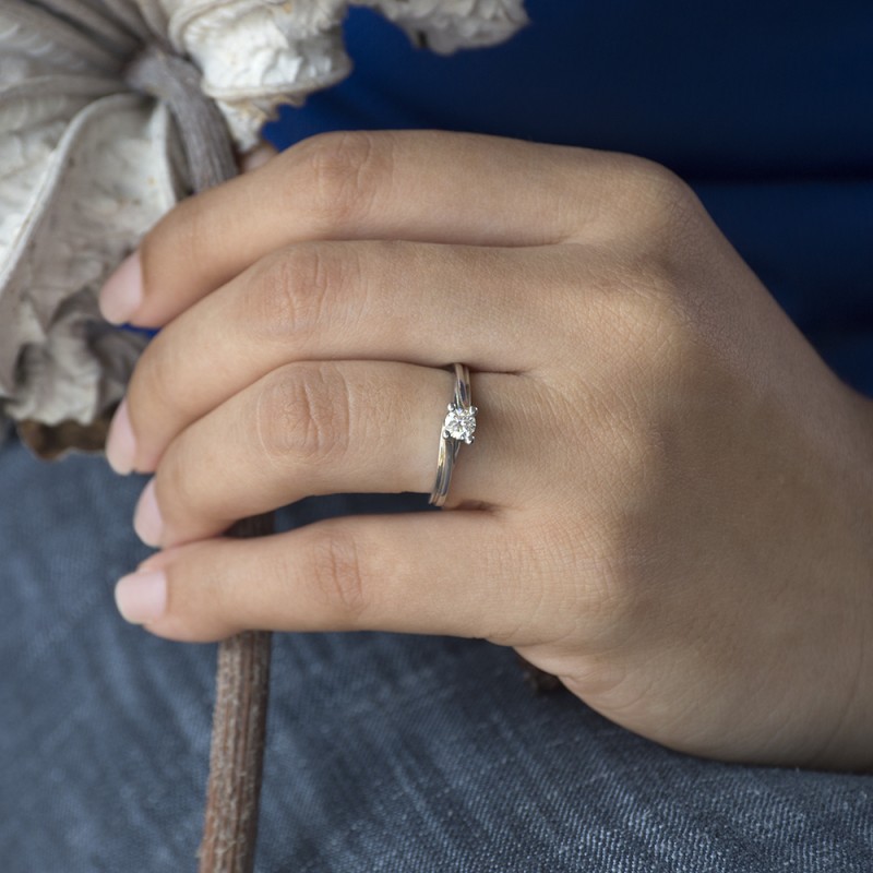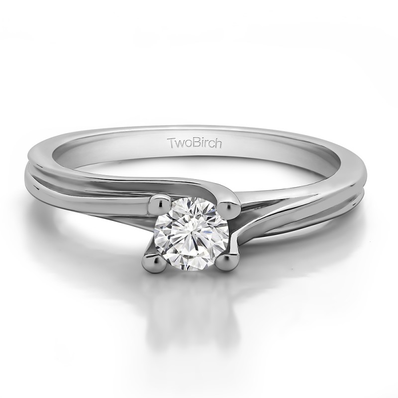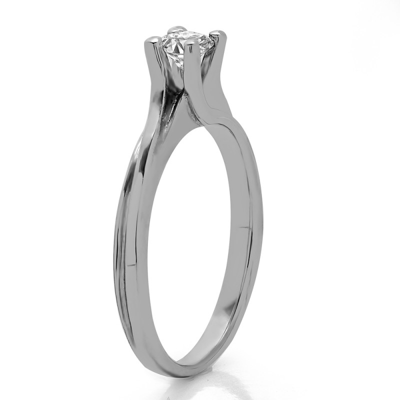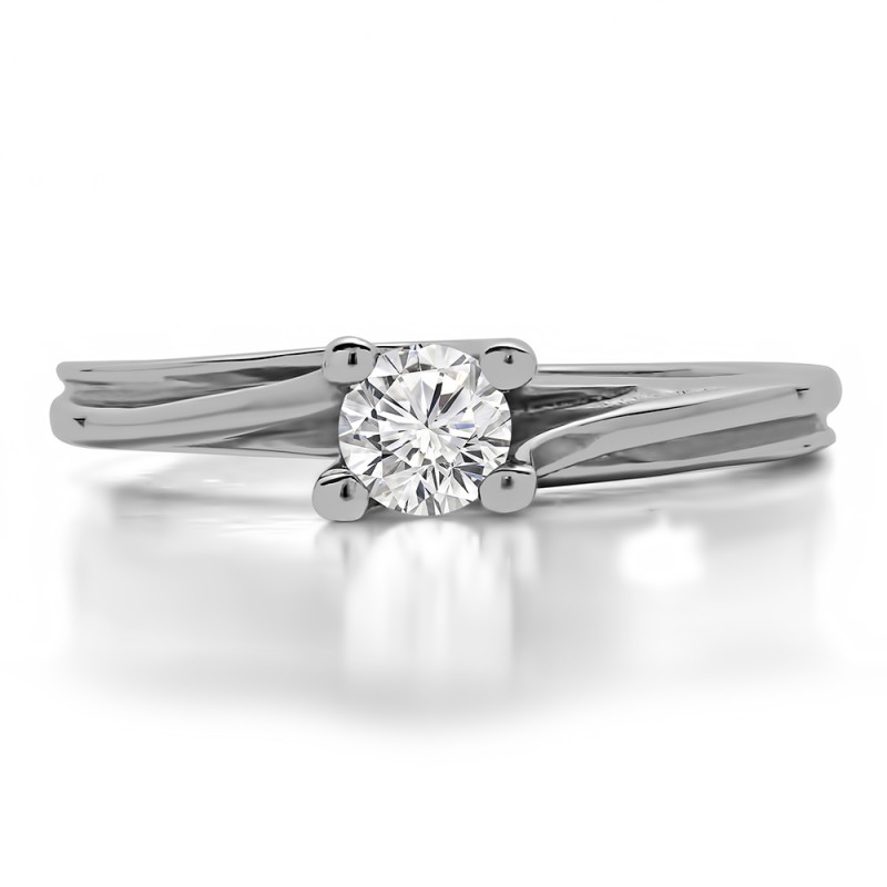This solitaire engagement ring features a round center stone weighing 0.33 carats. The center stone is set in a four prong bypass style setting. Each center diamond you select will have the following minimum specifications: Good Cut, Symmetry, Proportions and No Fluorescence. Since we do not keep center diamonds in stock, please allow 1 to 2 weeks for production of your engagement ring and procurement of the center diamond. The band measures approximately 2 millimeters and weighs about 3.5 grams.