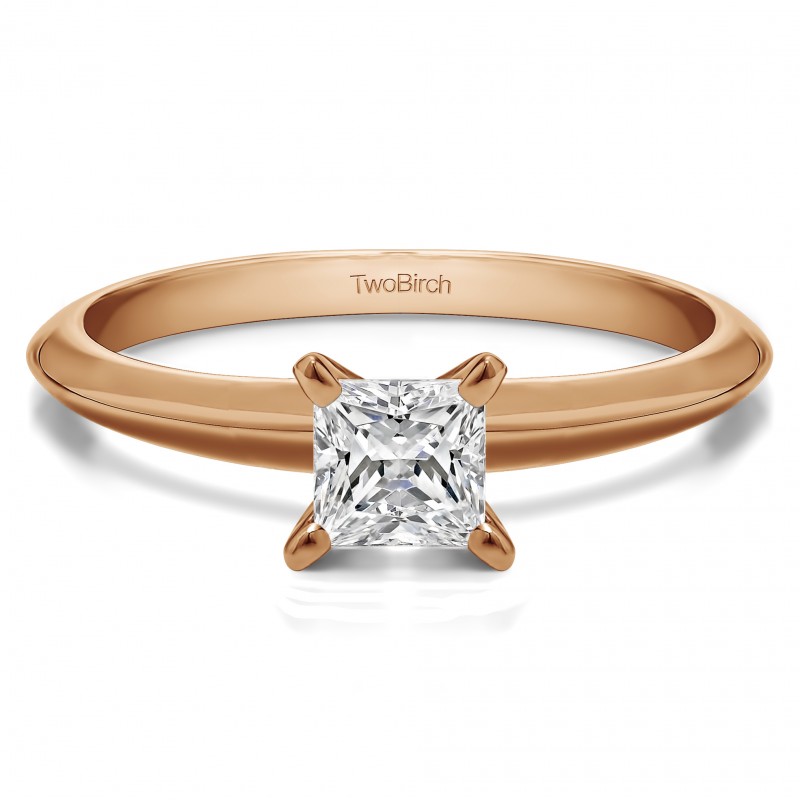 This solitaire engagement ring features a princess cut center stone weighing 0.33 carats. The center stone is set with a four prong setting. Each center diamond you select will have the following minimum specifications: Good Cut, Symmetry, Proportions and No Fluorescence. Since we do not keep center diamonds in stock, please allow 1 to 2 weeks for production of your engagement ring and procurement of the center diamond. The band measures approximately 2 millimeters and weighs about 2.45 grams.