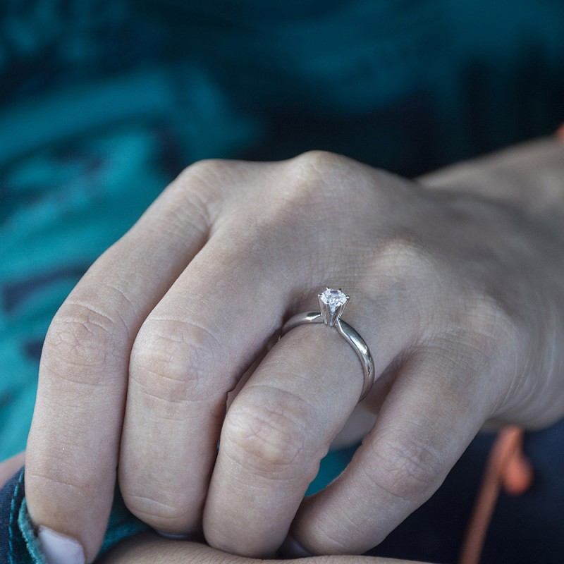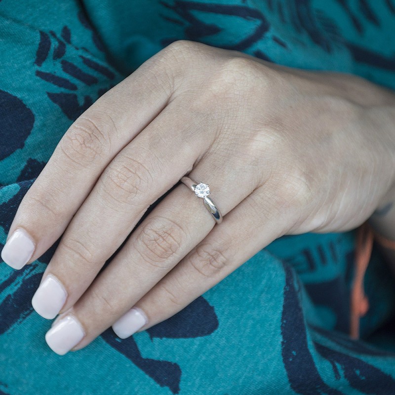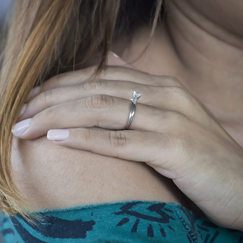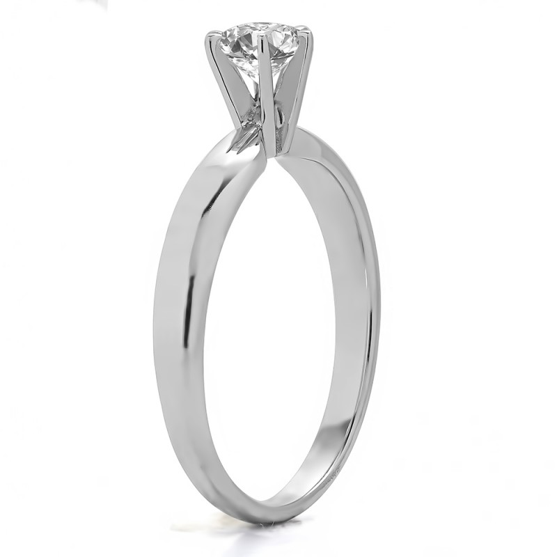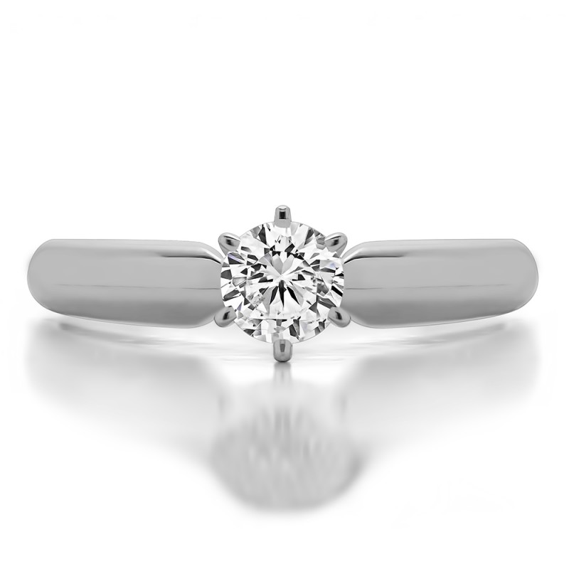 This solitaire engagement ring features a round center stone weighing 0.33 carats. The center stone is set in a traditional four prong setting and pinched center band. Each center diamond you select will have the following minimum specifications: Good Cut, Symmetry, Proportions and No Fluorescence. Since we do not keep center diamonds in stock, please allow 1 to 2 weeks for production of your engagement ring and procurement of the center diamond. The band measures approximately 2 millimeters and weighs about 3.4 grams.