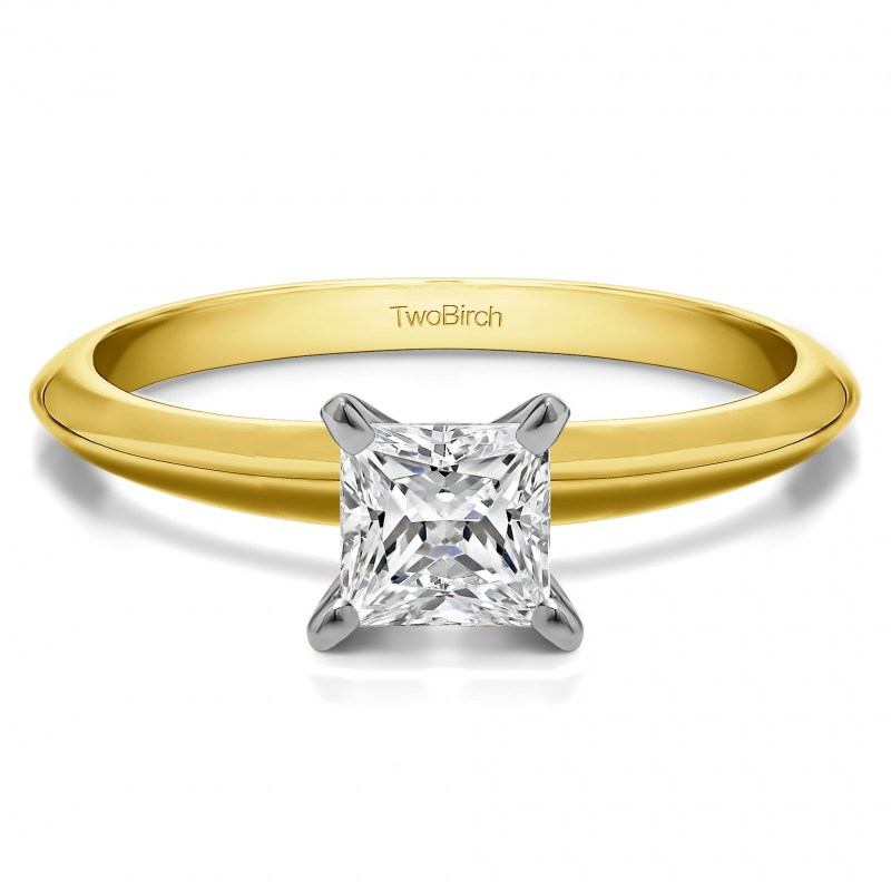 This solitaire engagement ring features a princess cut center stone weighing 0.5 carats. The center stone is set with a four prong setting. Each center diamond you select will have the following minimum specifications: Good Cut, Symmetry, Proportions and No Fluorescence. Since we do not keep center diamonds in stock, please allow 1 to 2 weeks for production of your engagement ring and procurement of the center diamond. The band measures approximately 2 millimeters and weighs about 3.03 grams.