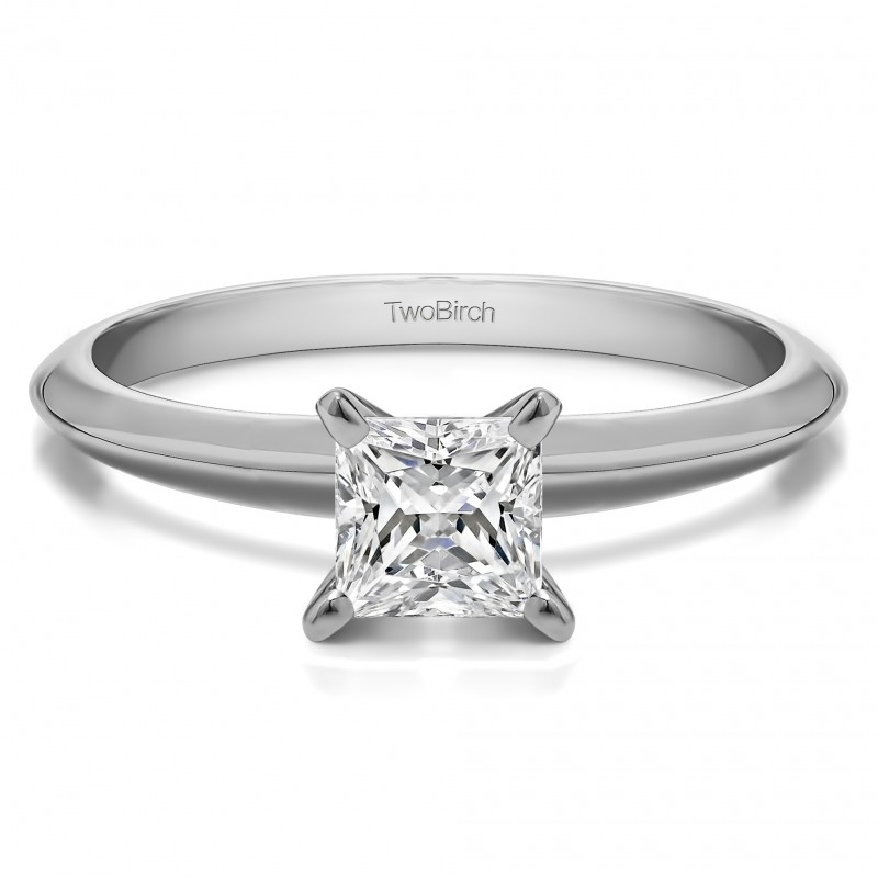 This solitaire engagement ring features a princess cut center stone weighing 0.5 carats. The center stone is set with a four prong setting. Each center diamond you select will have the following minimum specifications: Good Cut, Symmetry, Proportions and No Fluorescence. Since we do not keep center diamonds in stock, please allow 1 to 2 weeks for production of your engagement ring and procurement of the center diamond. The band measures approximately 2 millimeters and weighs about 3.03 grams.