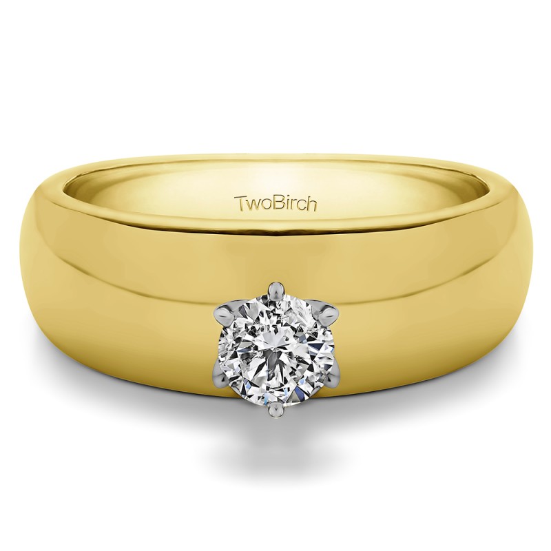 This solitaire engagement ring features a round center stone weighing 0.5 carats. The center stone is set with a traditional six prong setting on a very wide band. Each center diamond you select will have the following minimum specifications: Good Cut, Symmetry, Proportions and No Fluorescence. Since we do not keep center diamonds in stock, please allow 1 to 2 weeks for production of your engagement ring and procurement of the center diamond. The band measures approximately 2 millimeters and weighs about 10.6 grams.