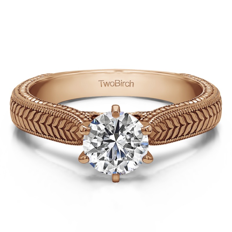 This solitaire engagement ring features a round center stone weighing 0.75 carats. The center stone is set with a traditional six prong setting. It features a cathedral profile, with a pinched shank and engraved designs. Each center diamond you select will have the following minimum specifications: Good Cut, Symmetry, Proportions and No Fluorescence. Since we do not keep center diamonds in stock, please allow 1 to 2 weeks for production of your engagement ring and procurement of the center diamond. The band measures approximately 2 millimeters and weighs about 5.5 grams.