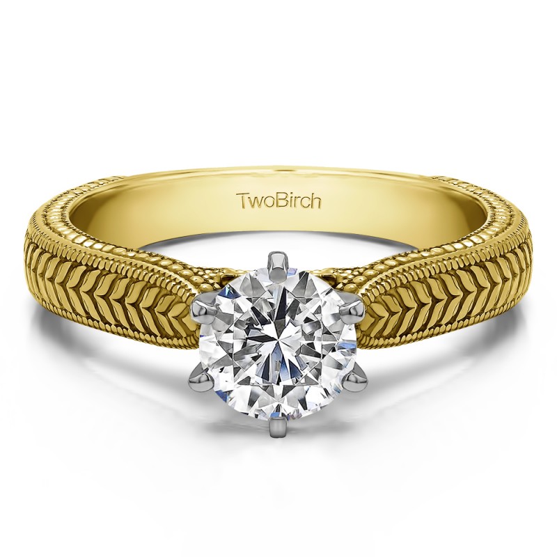 This solitaire engagement ring features a round center stone weighing 0.75 carats. The center stone is set with a traditional six prong setting. It features a cathedral profile, with a pinched shank and engraved designs. Each center diamond you select will have the following minimum specifications: Good Cut, Symmetry, Proportions and No Fluorescence. Since we do not keep center diamonds in stock, please allow 1 to 2 weeks for production of your engagement ring and procurement of the center diamond. The band measures approximately 2 millimeters and weighs about 5.5 grams.