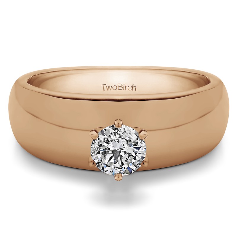 This solitaire engagement ring features a round center stone weighing 0.75 carats. The center stone is set with a traditional six prong setting on a very wide band. Each center diamond you select will have the following minimum specifications: Good Cut, Symmetry, Proportions and No Fluorescence. Since we do not keep center diamonds in stock, please allow 1 to 2 weeks for production of your engagement ring and procurement of the center diamond. The band measures approximately 2 millimeters and weighs about 10.7 grams.