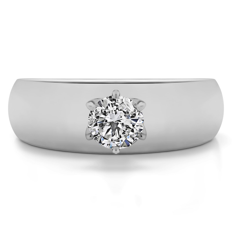 This solitaire engagement ring features a round center stone weighing 0.75 carats. The center stone is set with a traditional six prong setting on a very wide band. Each center diamond you select will have the following minimum specifications: Good Cut, Symmetry, Proportions and No Fluorescence. Since we do not keep center diamonds in stock, please allow 1 to 2 weeks for production of your engagement ring and procurement of the center diamond. The band measures approximately 2 millimeters and weighs about 10.7 grams.
