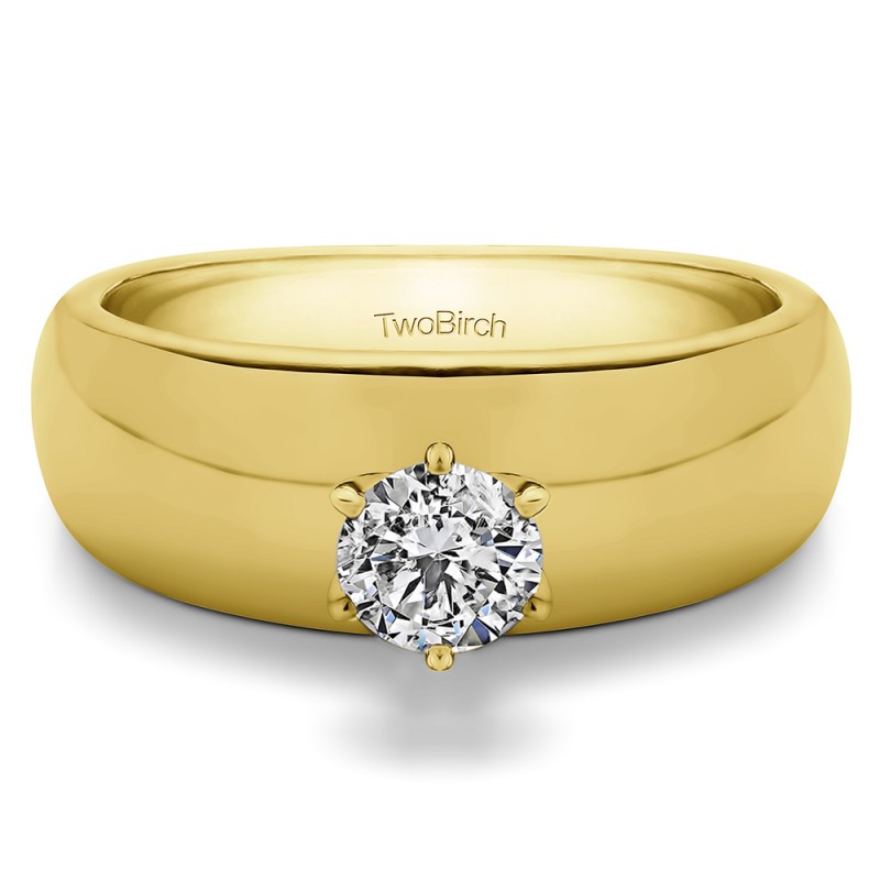 This solitaire engagement ring features a round center stone weighing 0.75 carats. The center stone is set with a traditional six prong setting on a very wide band. Each center diamond you select will have the following minimum specifications: Good Cut, Symmetry, Proportions and No Fluorescence. Since we do not keep center diamonds in stock, please allow 1 to 2 weeks for production of your engagement ring and procurement of the center diamond. The band measures approximately 2 millimeters and weighs about 10.7 grams.