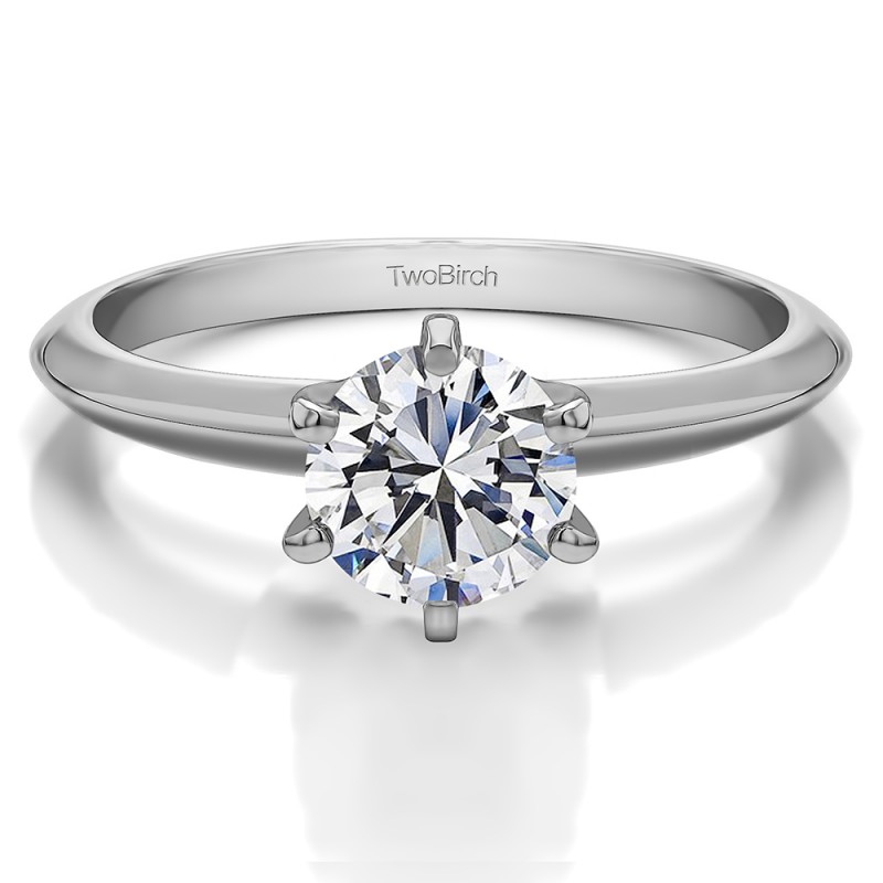 This solitaire engagement ring features a round center stone weighing 0.5 carats. The center stone is set with a traditional six prong setting. Each center diamond you select will have the following minimum specifications: Good Cut, Symmetry, Proportions and No Fluorescence. Since we do not keep center diamonds in stock, please allow 1 to 2 weeks for production of your engagement ring and procurement of the center diamond. The band measures approximately 2 millimeters and weighs about 3 grams.