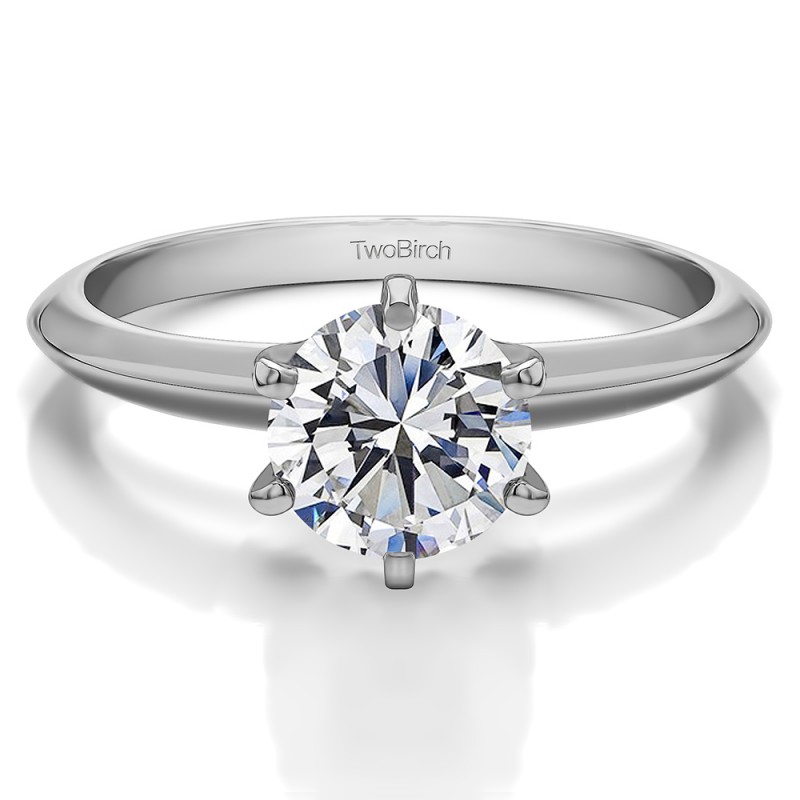 This solitaire engagement ring features a round center stone weighing 0.75 carats. The center stone is set with a traditional six prong setting. Each center diamond you select will have the following minimum specifications: Good Cut, Symmetry, Proportions and No Fluorescence. Since we do not keep center diamonds in stock, please allow 1 to 2 weeks for production of your engagement ring and procurement of the center diamond. The band measures approximately 2 millimeters and weighs about 3.1 grams.