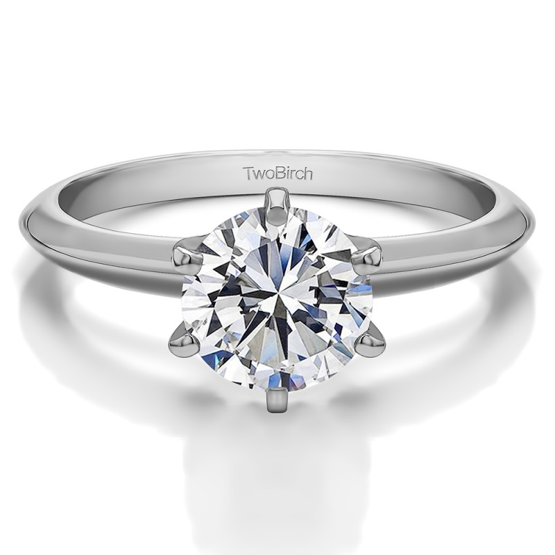 This solitaire engagement ring features a round center stone weighing 1.25 carats. The center stone is set with a traditional six prong setting. The center stone in this ring is moissanite with G to H color and VVS clarity. Since we do not keep center diamonds in stock, please allow 1 to 2 weeks for production of your engagement ring and procurement of the center diamond. The band measures approximately 2 millimeters and weighs about 3.2 grams.